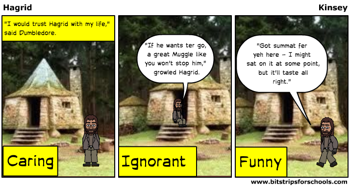 In the first 5 chapters of Harry Potter and the Philosopher's Stone we are introduced to the characters to the character of Hagrid. Hagrid is a caring person. He is caring because in the story Dumbledore said "I would trust Hagrid with my life". Hagrid is also an ignorant person at times. I know this because in the story he said "If h wants ter go, a great Muggle like you wont't stop him,". In the story Hagrid is also very funny. He says "Got summat fer yeh here - I might sat on it at some point, but it'll taste all right." Therefor in the first few chapters of the book we learn alot about Hagrid.